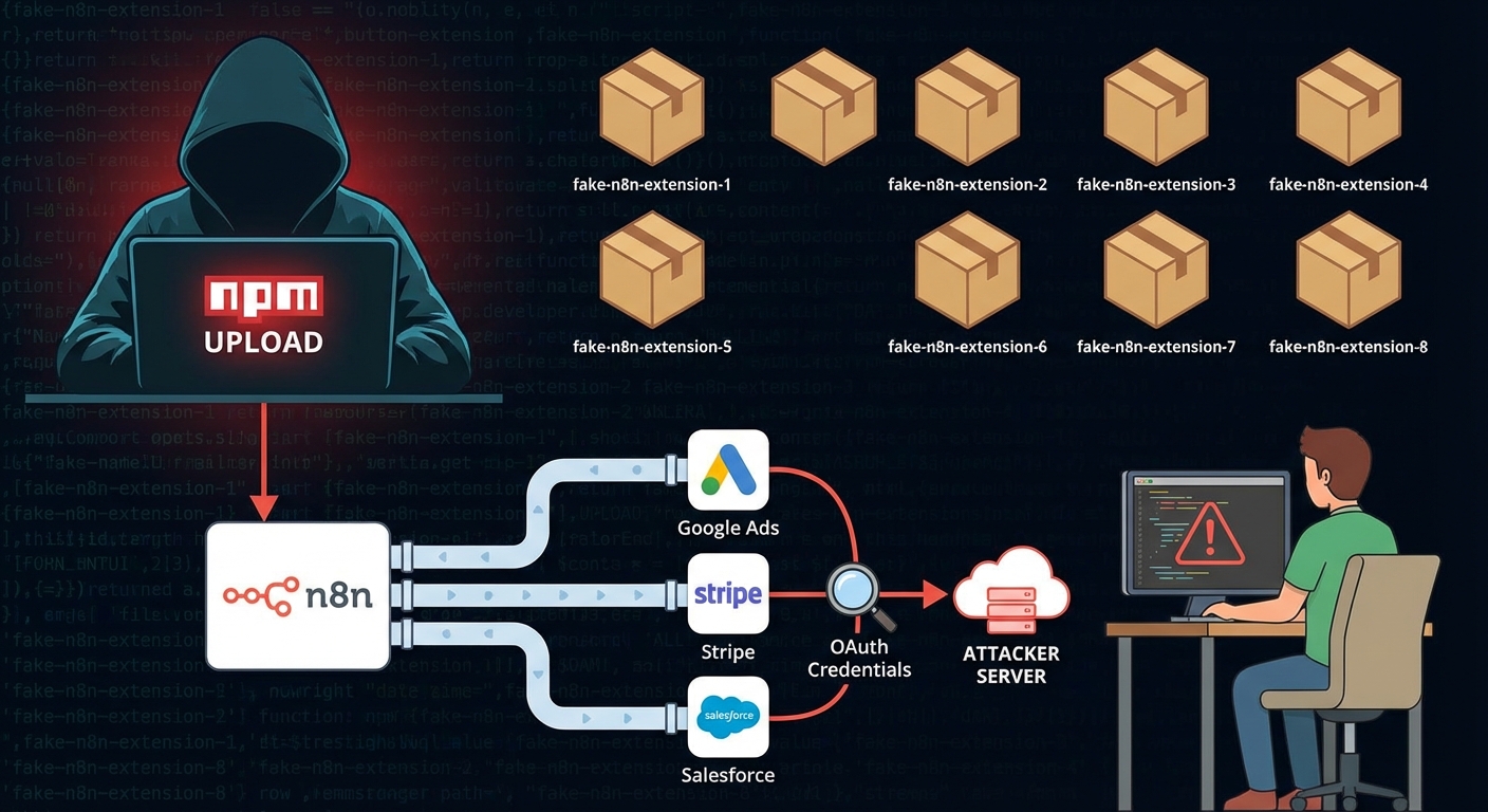นักแสดงภัยคุกคามได้อัปโหลดแพ็กเกจ npm ที่เป็นอันตรายจำนวน 8 รายการ ซึ่งปลอมแปลงเป็นส่วนขยายของแพลตฟอร์ม n8n เพื่อขโมยข้อมูลรับรอง OAuth ของนักพัฒนา การโจมตีนี้ใช้ประโยชน์จากแพลตฟอร์ม n8n ซึ่งเป็นแหล่งเก็บข้อมูลรับรองแบบรวมศูนย์ ทั้ง OAuth tokens, API keys และข้อมูลรับรองที่ละเอียดอ่อนสำหรับบริการที่ผสานรวมหลายสิบรายการ เช่น Google Ads, Stripe และ Salesforce. แพ็กเกจเหล่านี้เลียนแบบการผสานรวมที่ถูกต้องและหลอกให้ผู้ใช้เชื่อมโยงบัญชีเพื่อดึงข้อมูลโทเค็นไปยังเซิร์ฟเวอร์ของผู้โจมตี