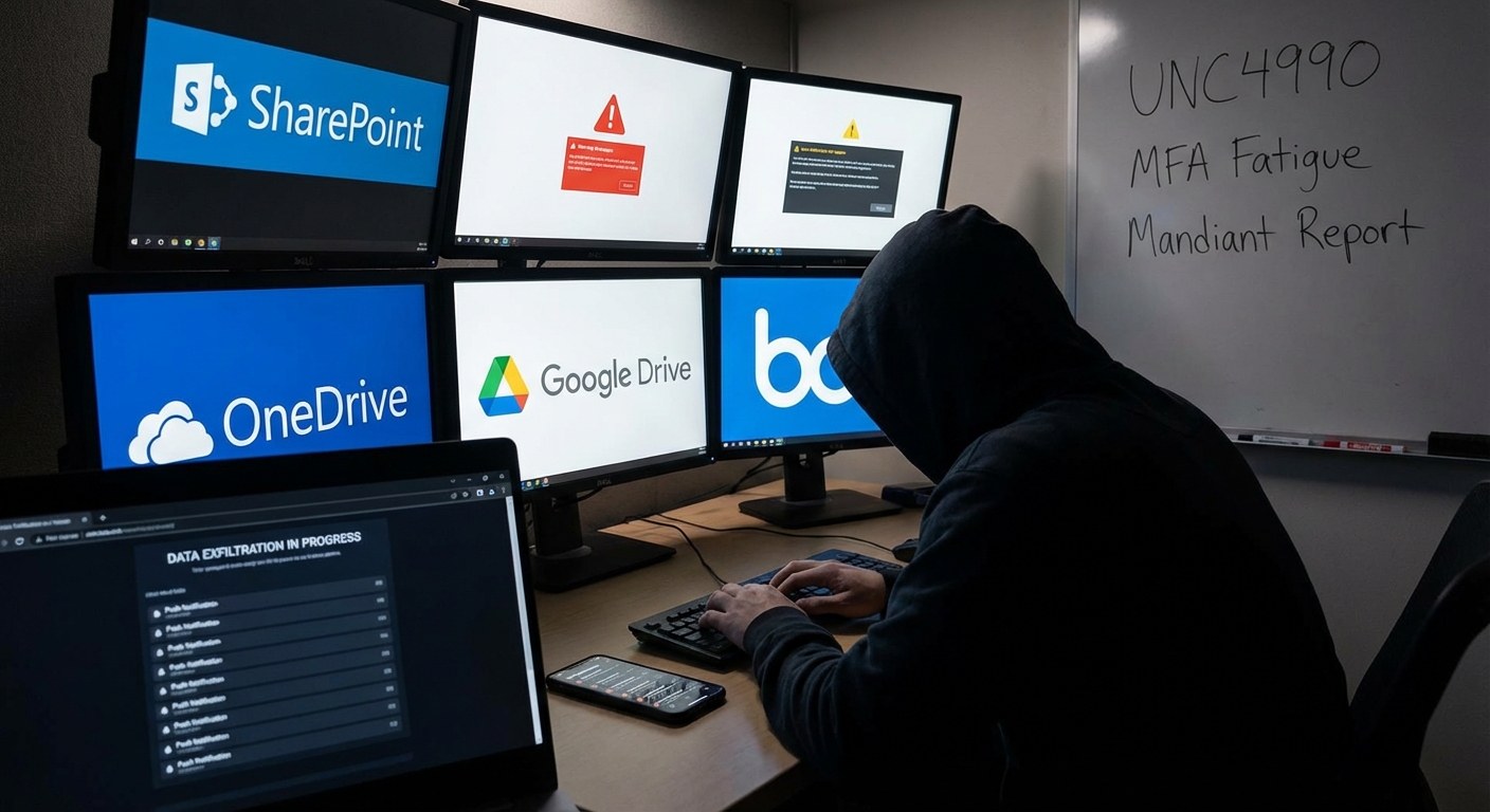 กลุ่มผู้คุกคามไซเบอร์กำลังมุ่งเป้าไปที่บริการแชร์ไฟล์บนคลาวด์ยอดนิยม เช่น SharePoint, OneDrive, Google Drive และ Box เพื่อขโมยข้อมูลองค์กร โดยใช้วิธีการฟิชชิ่งขั้นสูงเพื่อขโมยข้อมูลรับรอง และเทคนิค MFA Bombing หรือ Push Fatigue เพื่อหลบเลี่ยงการยืนยันตัวตนแบบหลายปัจจัย (MFA) หลังจากเข้าถึงระบบได้สำเร็จ ผู้โจมตีจะดาวน์โหลดเอกสารและข้อมูลสำคัญของบริษัท Mandiant ระบุว่ากลุ่มที่อยู่เบื้องหลังการโจมตีนี้คือ UNC4990 ซึ่งมีรูปแบบการโจมตีที่คล้ายคลึงกับ SCATTERED SPIDER หรือที่รู้จักกันในชื่อ 0ktapus หรือ MFA Bombing group