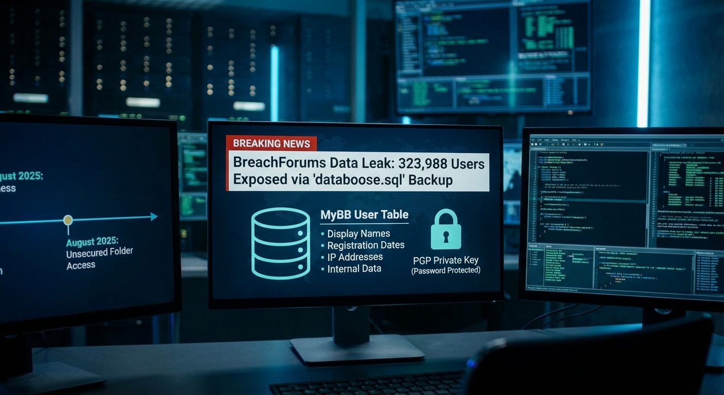 ฟอรัมแฮกเกอร์ BreachForums ซึ่งเป็นที่รู้จัก ได้ประสบเหตุข้อมูลรั่วไหล โดยฐานข้อมูลผู้ใช้งานถูกเผยแพร่ออนไลน์ ข้อมูลที่รั่วไหลคือตารางฐานข้อมูลผู้ใช้งาน MyBB ชื่อ ‘databoose.sql’ ที่มีบันทึกสมาชิก 323,988 รายการ ซึ่งรวมถึงชื่อที่แสดง วันที่ลงทะเบียน ที่อยู่ IP และข้อมูลภายในอื่นๆ การรั่วไหลนี้เกิดขึ้นเนื่องจากไฟล์สำรองของฐานข้อมูลผู้ใช้งานถูกจัดเก็บชั่วคราวในโฟลเดอร์ที่ไม่ปลอดภัยและถูกดาวน์โหลดไปเพียงครั้งเดียวในเดือนสิงหาคม 2025 โดย PGP private key ของฟอรัมก็รั่วไหลออกมาด้วย แต่ได้รับการป้องกันด้วยรหัสผ่าน
