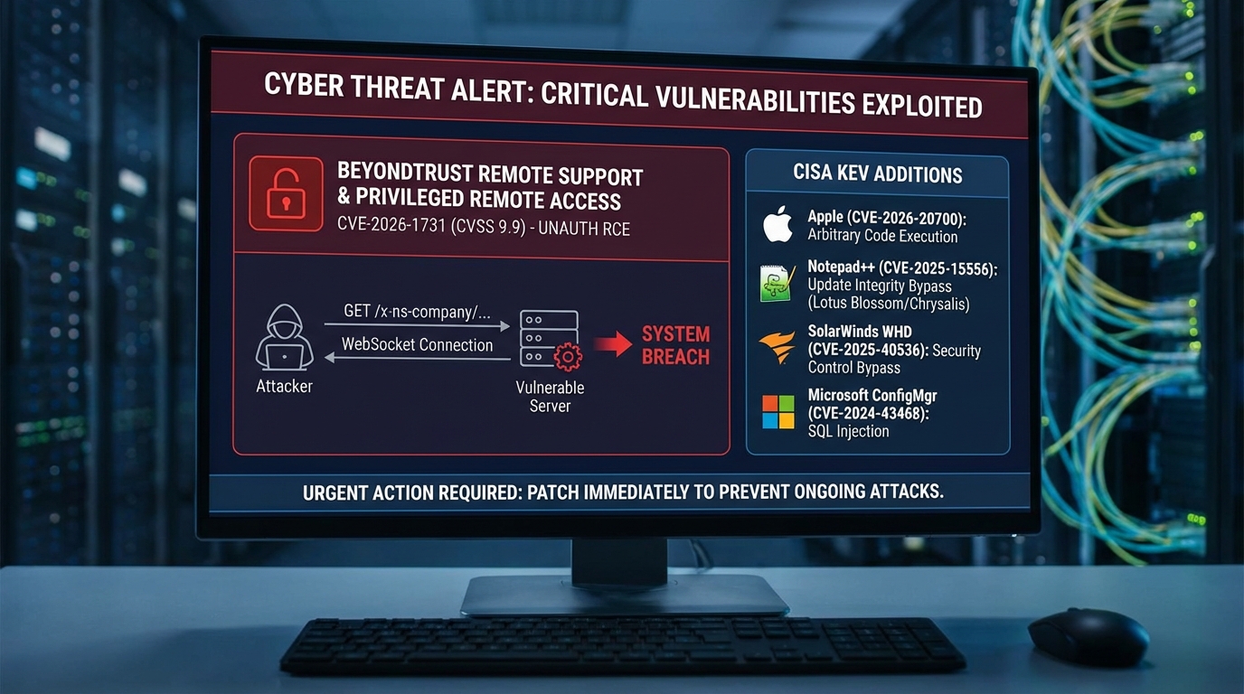นักแสดงภัยคุกคามเริ่มใช้ประโยชน์จากช่องโหว่ด้านความปลอดภัยร้ายแรงที่เพิ่งเปิดเผยของ BeyondTrust Remote Support (RS) และ Privileged Remote Access (PRA) (CVE-2026-1731, คะแนน CVSS 9.9) ซึ่งอาจนำไปสู่การประมวลผลโค้ดจากระยะไกลโดยไม่ต้องยืนยันตัวตน (RCE) โดยผู้โจมตีใช้เทคนิคการดึงค่า x-ns-company ก่อนตั้งค่าช่องสัญญาณ WebSocket นอกจากนี้ CISA ได้เพิ่มช่องโหว่อีก 4 รายการลงในรายการ Known Exploited Vulnerabilities (KEV) เนื่องจากมีหลักฐานการโจมตีในวงกว้าง ได้แก่ CVE-2026-20700 ของ Apple (การประมวลผลโค้ดโดยพลการ), CVE-2025-15556 ของ Notepad++ (การข้ามการตรวจสอบความสมบูรณ์ในการอัปเดต ซึ่งเชื่อมโยงกับกลุ่ม Lotus Blossom ที่ใช้แบ็คดอร์ Chrysalis), CVE-2025-40536 ของ SolarWinds Web Help Desk (การข้ามการควบคุมความปลอดภัย) และ CVE-2024-43468 ของ Microsoft Configuration Manager (SQL Injection) ซึ่งชี้ให้เห็นถึงความเร่งด่วนในการแพตช์ระบบเพื่อป้องกันการโจมตีที่กำลังดำเนินอยู่