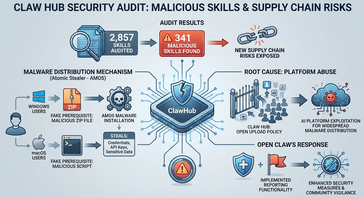การตรวจสอบความปลอดภัยของสกิล 2,857 รายการบน ClawHub พบสกิลที่เป็นอันตราย 341 รายการ ซึ่งเปิดเผยผู้ใช้ต่อความเสี่ยงด้านซัพพลายเชนใหม่ๆ สกิลเหล่านี้ใช้ข้อกำหนดเบื้องต้นปลอมเพื่อติดตั้ง Atomic Stealer (AMOS) ซึ่งเป็นมัลแวร์ขโมยข้อมูลบน macOS และ Windows การโจมตีเกี่ยวข้องกับการหลอกให้ผู้ใช้ดาวน์โหลดไฟล์ ZIP ที่มีมัลแวร์บน Windows หรือรันสคริปต์บน macOS เพื่อขโมยข้อมูลรับรอง, API keys และข้อมูลที่ละเอียดอ่อนอื่นๆ ปัญหาหลักเกิดจาก ClawHub เปิดให้ใครก็ได้อัปโหลดสกิล ทำให้เกิดการละเมิดแพลตฟอร์ม AI แบบโอเพนซอร์สเพื่อเผยแพร่มัลแวร์ในวงกว้าง ทาง OpenClaw ได้เพิ่มฟังก์ชันการรายงานเพื่อรับมือกับปัญหานี้แล้ว.