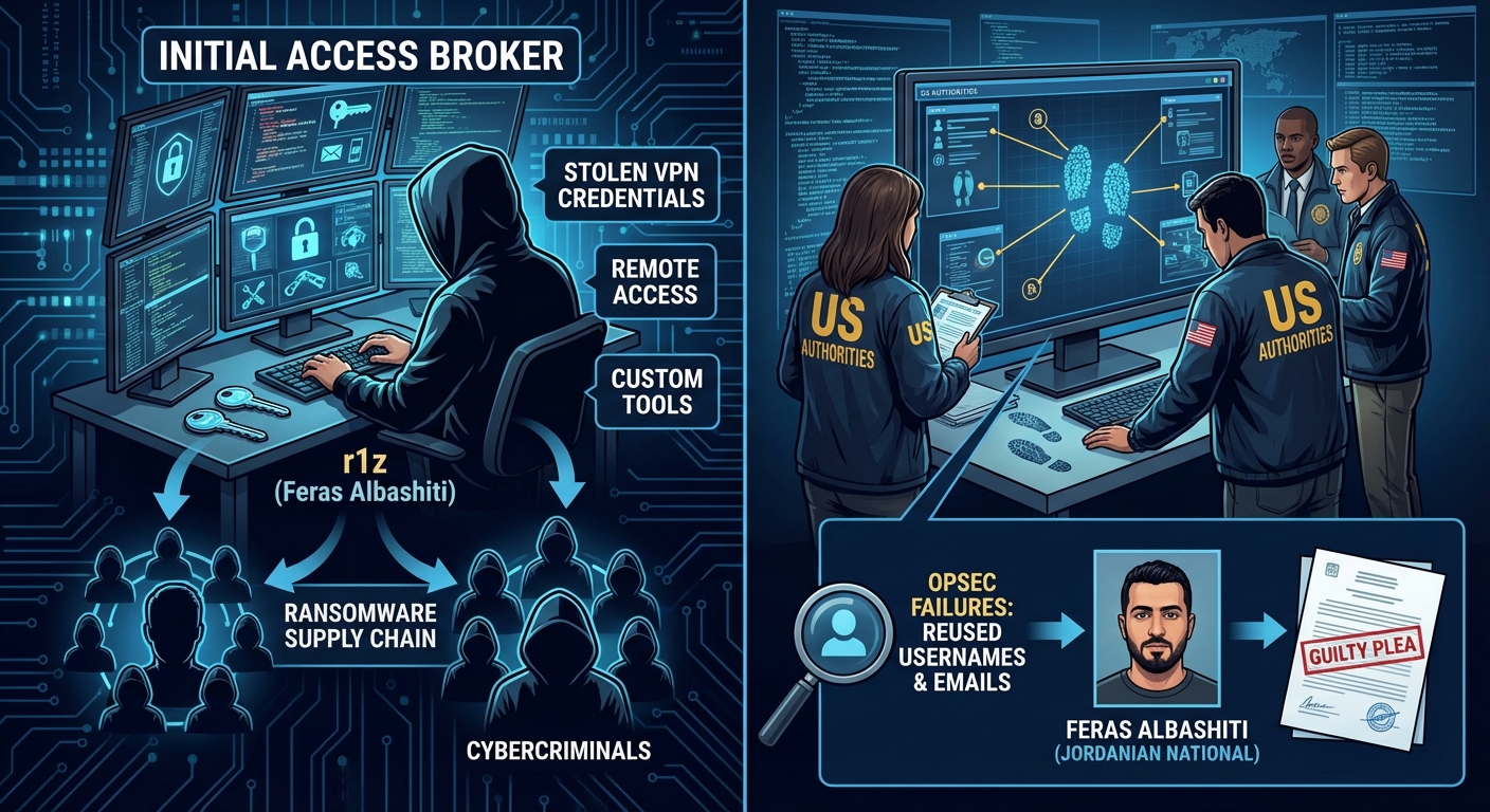 ทางการสหรัฐฯ ได้เปิดเผยตัวตนของ ‘r1z’ ซึ่งเป็น Initial Access Broker (IAB) ที่ลักลอบขายช่องทางการเข้าถึงเครือข่ายองค์กรทั่วโลก โดยเขามีการเสนอขายข้อมูลรับรอง VPN ที่ถูกขโมย, สิทธิ์การเข้าถึงระยะไกล (remote access) ไปยังสภาพแวดล้อมขององค์กร และเครื่องมือที่กำหนดเองเพื่อหลีกเลี่ยงการควบคุมความปลอดภัย กิจกรรมของเขาเป็นส่วนหนึ่งของห่วงโซ่อุปทานของแรนซัมแวร์ โดยการให้ช่องทางเข้าถึงองค์กรเป้าหมายที่พร้อมใช้งานแก่อาชญากรไซเบอร์รายอื่น การสืบสวนพบว่าข้อผิดพลาดด้านความปลอดภัยในการปฏิบัติงาน (OPSEC) ที่อ่อนแอและซ้ำซ้อนของ ‘r1z’ (เช่น การใช้ชื่อผู้ใช้และอีเมลซ้ำ) ทำให้เจ้าหน้าที่บังคับใช้กฎหมายสามารถระบุตัวตนที่แท้จริงของเขาได้ว่าเป็น Feras Albashiti สัญชาติจอร์แดน ซึ่งต่อมาได้รับสารภาพผิดในการขายการเข้าถึงบริษัทหลายสิบแห่ง