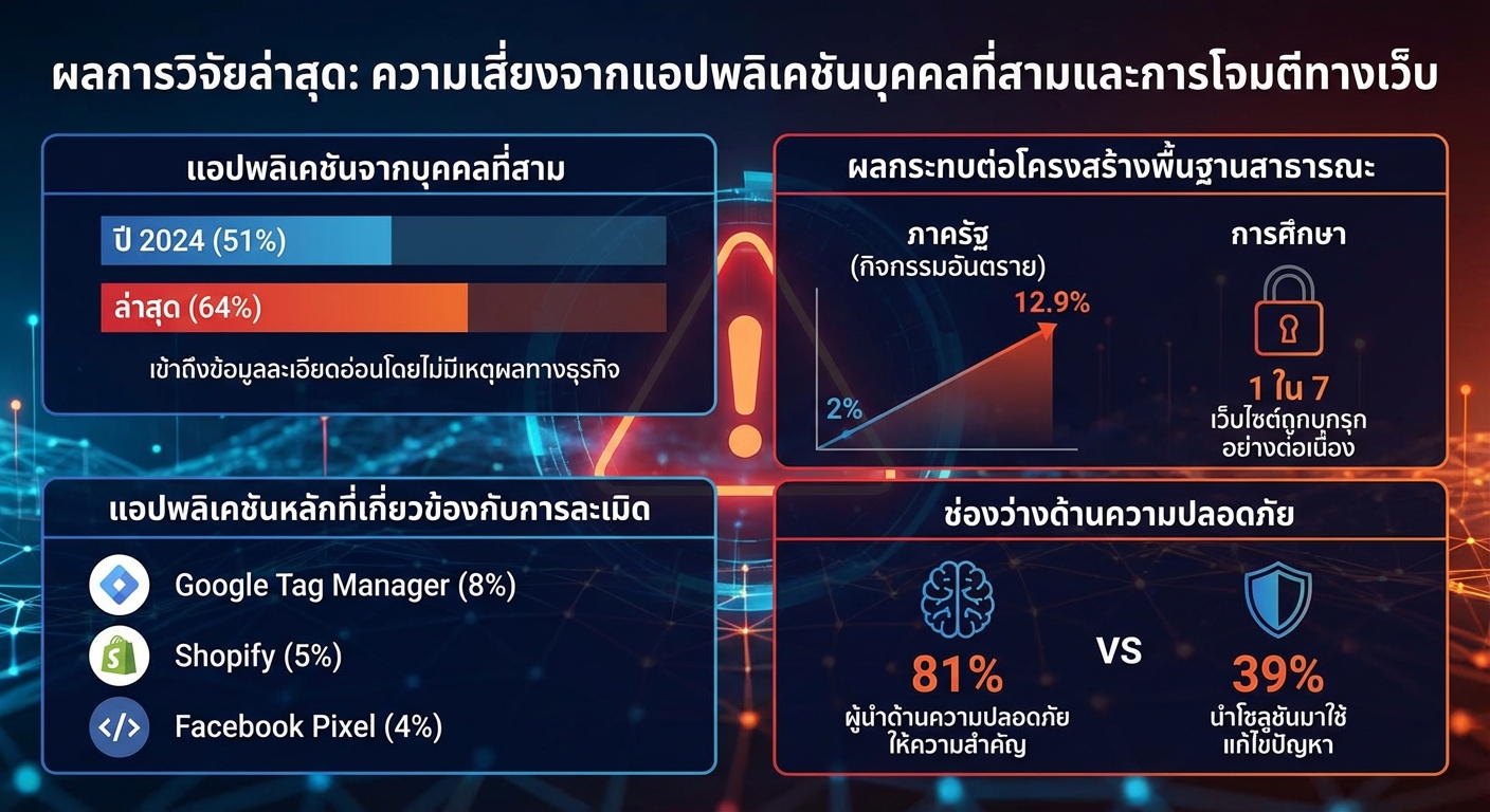 ผลการวิจัยล่าสุดที่วิเคราะห์เว็บไซต์ชั้นนำ 4,700 แห่ง พบว่า 64% ของแอปพลิเคชันจากบุคคลที่สามเข้าถึงข้อมูลที่ละเอียดอ่อนโดยไม่มีเหตุผลทางธุรกิจ ซึ่งเพิ่มขึ้นจาก 51% ในปี 2024 สถานการณ์นี้ส่งผลกระทบอย่างรุนแรงต่อโครงสร้างพื้นฐานสาธารณะ โดยกิจกรรมที่เป็นอันตรายในภาครัฐพุ่งสูงขึ้นจาก 2% เป็น 12.9% และ 1 ใน 7 ของเว็บไซต์การศึกษาแสดงสัญญาณของการถูกบุกรุกอย่างต่อเนื่อง แอปพลิเคชันหลักที่ถูกระบุว่ามีส่วนเกี่ยวข้องกับการละเมิด ได้แก่ Google Tag Manager (8%), Shopify (5%) และ Facebook Pixel (4%) แม้ว่า 81% ของผู้นำด้านความปลอดภัยจะให้ความสำคัญกับการโจมตีทางเว็บ แต่มีเพียง 39% เท่านั้นที่ได้นำโซลูชันมาใช้เพื่อแก้ไขปัญหานี้.