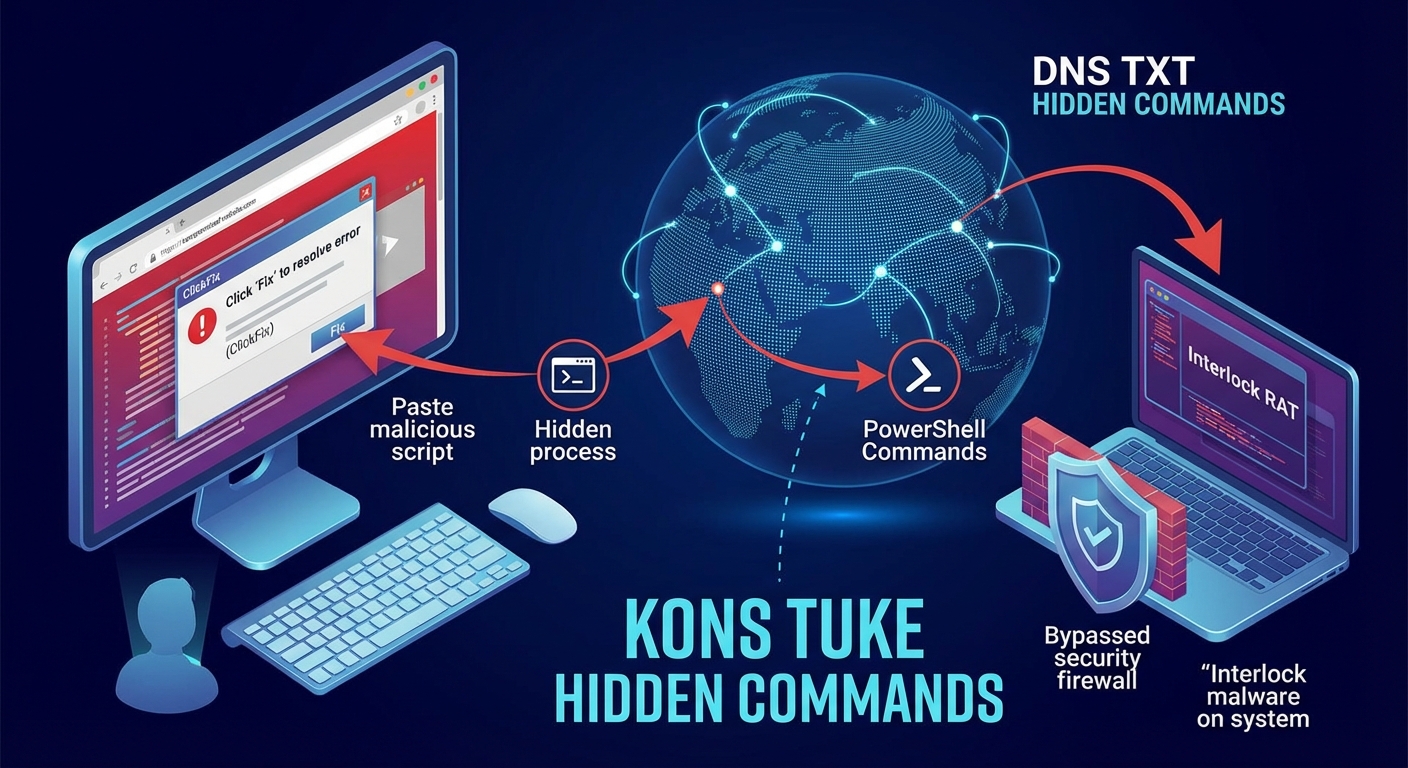 แคมเปญ KongTuke ซึ่งเริ่มตั้งแต่กลางปี 2025 ได้พัฒนาเทคนิคการโจมตีอย่างซับซ้อน โดยใช้กลยุทธ์ ‘ClickFix’ เพื่อหลอกผู้ใช้งานให้วางสคริปต์อันตรายผ่านข้อผิดพลาดปลอมบนเว็บไซต์ที่ถูกบุกรุก วิธีใหม่นี้ใช้บันทึก DNS TXT เพื่อซ่อนคำสั่งขั้นถัดไปในการดึงและรันสคริปต์ PowerShell ที่เป็นอันตราย ทำให้ยากต่อการตรวจจับโดยระบบรักษาความปลอดภัยแบบดั้งเดิม และนำไปสู่การติดตั้งมัลแวร์ร้ายแรง เช่น Interlock RAT