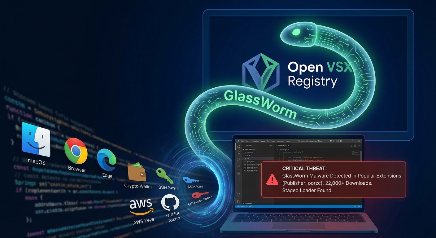 GlassWorm เป็นภัยคุกคามร้ายแรงต่อนักพัฒนาที่ใช้ Open VSX Registry โดยส่วนขยาย VSX ยอดนิยมถูกเปลี่ยนเป็นพาหะในการแพร่กระจายมัลแวร์ ผู้โจมตีได้บุกรุกบัญชีผู้เผยแพร่ (oorzc) ที่น่าเชื่อถือและผลักดันการอัปเดตที่เป็นอันตรายซึ่งดูเหมือนการเผยแพร่ปกติ แต่แท้จริงแล้วมีตัวโหลด (loader) แบบ staged ซ่อนอยู่ ส่วนขยายเหล่านี้มีการดาวน์โหลดมากกว่า 22,000 ครั้ง และเป็นเครื่องมือที่ใช้กันอย่างแพร่หลายสำหรับนักพัฒนา ทำให้งานพัฒนาประจำวันกลายเป็นช่องทางโจมตีที่อาจเกิดขึ้นได้ มัลแวร์นี้มุ่งเป้าไปที่ระบบ macOS เพื่อขโมยข้อมูลเบราว์เซอร์, กระเป๋าเงินดิจิทัล, ไฟล์สำคัญ, SSH keys, AWS credentials และ GitHub/npm tokens.