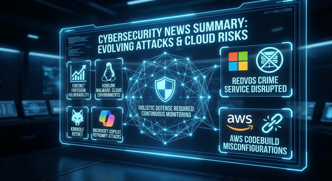 สรุปข่าวสารด้านความปลอดภัยทางไซเบอร์ประจำสัปดาห์นี้ เน้นย้ำถึงการโจมตีที่พัฒนาขึ้น, เฟรมเวิร์กมัลแวร์ และการตั้งค่าคลาวด์ที่ผิดพลาด ซึ่งกำลังเปลี่ยนแปลงภูมิทัศน์การป้องกันทางไซเบอร์ ช่องโหว่ร้ายแรงใน Fortinet FortiSIEM ถูกโจมตีอย่างหนัก, การแพร่กระจายของมัลแวร์ VoidLink บน Linux ที่มุ่งเป้าไปที่สภาพแวดล้อมคลาวด์, การหยุดชะงักบริการอาชญากรรม RedVDS ของ Microsoft, การแพร่กระจายของบ็อตเน็ต Kimwolf, การโจมตี Microsoft Copilot ด้วย Reprompt, และความเสี่ยงด้าน Supply Chain จากการตั้งค่า AWS CodeBuild ที่ผิดพลาด บทความเน้นย้ำว่าภัยคุกคามในปัจจุบันเกิดจากจุดอ่อนที่เชื่อมโยงกัน และผู้โจมตีกำลังใช้ระบบอัตโนมัติและเครื่องมือที่มีอยู่เพื่อแทรกซึมและควบคุม การป้องกันจึงจำเป็นต้องมองภาพรวมของสภาพแวดล้อมทั้งหมดอย่างต่อเนื่อง