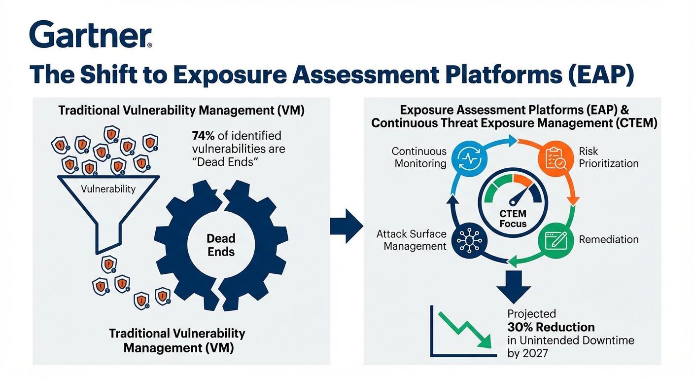 Gartner ได้เปิดตัวหมวดหมู่ใหม่สำหรับแพลตฟอร์มการประเมินความเสี่ยง (Exposure Assessment Platforms – EAP) ซึ่งส่งสัญญาณถึงการเปลี่ยนแปลงจากการจัดการช่องโหว่ (Vulnerability Management – VM) แบบดั้งเดิม รายงานชี้ให้เห็นว่า 74% ของช่องโหว่ที่ระบุเป็น ‘ทางตัน’ ซึ่ง EAP ถูกออกแบบมาเพื่อแก้ไขปัญหานี้โดยมุ่งเน้นที่การบริหารจัดการความเสี่ยงจากการถูกโจมตีอย่างต่อเนื่อง (Continuous Threat Exposure Management – CTEM) และคาดว่าจะลดเวลาหยุดทำงานโดยไม่ตั้งใจลง 30% ภายในปี 2027