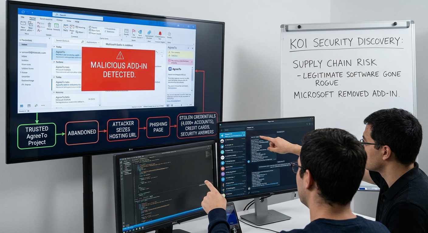 นักวิจัยด้านความปลอดภัยได้ค้นพบแอดอิน Microsoft Outlook ที่เป็นอันตราย ซึ่งเป็นกรณีแรกที่มีการบันทึกไว้ว่าถูกใช้โจมตีผู้ใช้งานจริง แอดอินตัวนี้มีชื่อว่า AgreeTo ซึ่งเป็นโปรแกรมจัดตารางการประชุมที่เคยถูกกฎหมาย ได้ถูกผู้โจมตีเข้ายึดครองและใช้ขโมยข้อมูลการเข้าสู่ระบบ Microsoft Account กว่า 4,000 รายการ รวมถึงหมายเลขบัตรเครดิตและคำตอบของคำถามเพื่อความปลอดภัยทางธนาคาร สาเหตุเกิดจากนักพัฒนาเดิมละทิ้งโครงการ ทำให้ผู้โจมตีสามารถลงทะเบียน URL โฮสติ้งที่ถูกทิ้งร้างและใช้เป็นหน้าฟิชชิ่งได้ โดยที่ Microsoft ไม่ได้ตรวจสอบเนื้อหาของแอดอินอย่างต่อเนื่องหลังจากการอนุมัติครั้งแรก ข้อมูลที่ถูกขโมยถูกส่งผ่าน Telegram bot และ Koi Security เป็นผู้ค้นพบการโจมตีนี้ Microsoft ได้ถอนแอดอินนี้ออกจาก Store แล้ว เน้นย้ำถึงความเสี่ยงด้าน Supply Chain ที่ซอฟต์แวร์ที่เคยน่าเชื่อถืออาจกลายเป็นภัยคุกคามได้หากโครงสร้างพื้นฐานถูกละทิ้ง