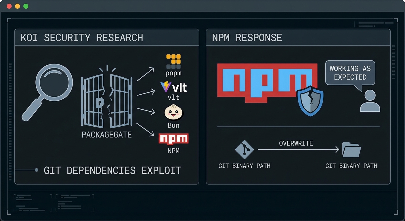 กลไกการป้องกันที่ NPM นำมาใช้หลังจากถูกโจมตีแบบซัพพลายเชน ‘Shai-Hulud’ มีจุดอ่อนที่ทำให้ผู้ไม่หวังดีสามารถหลีกเลี่ยงการป้องกันเหล่านั้นได้ผ่านการพึ่งพา Git (Git dependencies) นักวิจัยด้านความปลอดภัยของ Koi ค้นพบช่องโหว่ PackageGate ในเครื่องมือจัดการแพ็กเกจ JavaScript หลายตัว เช่น pnpm, vlt, Bun และ NPM โดย NPM ได้ปฏิเสธรายงานโดยระบุว่า ‘ทำงานได้ตามที่คาดไว้’ แม้ว่าจะมีการค้นพบช่องทางการรันโค้ดที่เป็นอันตรายโดยการเขียนทับพาธของ Git binary