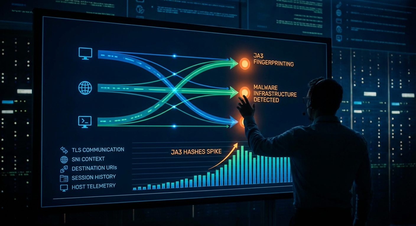 JA3 Fingerprinting ซึ่งเป็นเทคนิคการระบุตัวตนเครื่องมือโจมตีผ่านรูปแบบการสื่อสารเครือข่าย TLS ที่เป็นเอกลักษณ์ ยังคงมีประสิทธิภาพสูงในการตรวจจับและติดตามโครงสร้างพื้นฐานของผู้โจมตี แม้จะเคยถูกมองว่าล้าสมัย การวิเคราะห์ล่าสุดจาก Any.Run ชี้ให้เห็นว่าการเพิ่มขึ้นอย่างผิดปกติของ JA3 hashes สามารถบ่งชี้ถึงการปรับใช้มัลแวร์ใหม่ สคริปต์โจมตีอัตโนมัติ หรือการเปิดใช้งานโครงสร้างพื้นฐานของผู้โจมตีได้ก่อนที่ลายเซ็นแบบดั้งเดิมจะถูกพัฒนาขึ้น อย่างไรก็ตาม การใช้ JA3 ต้องพิจารณาร่วมกับข้อมูลบริบทอื่นๆ เช่น Server Name Indication (SNI), Destination URIs, ประวัติเซสชัน และ Host Telemetry เพื่อให้การตรวจจับมีประสิทธิภาพและแม่นยำยิ่งขึ้น ช่วยให้ทีมรักษาความปลอดภัยสามารถระบุการปฏิบัติการของผู้โจมตีได้ตั้งแต่ระยะเริ่มต้น.