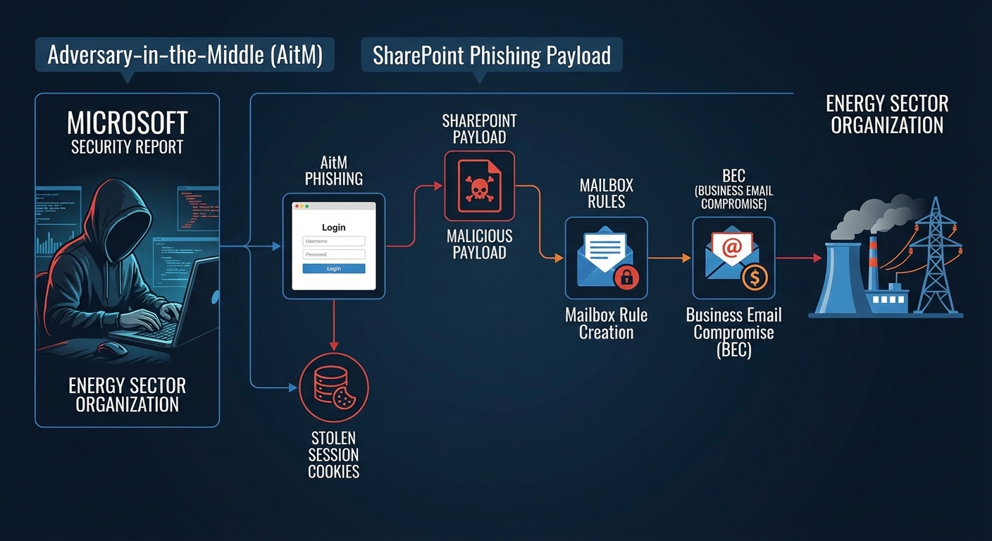 ไมโครซอฟต์ได้รายงานการตรวจพบแคมเปญฟิชชิ่งแบบ Adversary-in-the-Middle (AitM) และ Business Email Compromise (BEC) แบบหลายขั้นตอนที่มุ่งเป้าไปที่องค์กรในภาคพลังงาน การโจมตีนี้ใช้บริการ SharePoint สำหรับการส่งเพย์โหลดฟิชชิ่ง, สร้างกฎในกล่องจดหมายเพื่อรักษาการเข้าถึงและหลบเลี่ยงการตรวจจับของผู้ใช้ และใช้คุกกี้เซสชันที่ถูกขโมยไปเพื่อดำเนินกิจกรรม BEC ในวงกว้าง