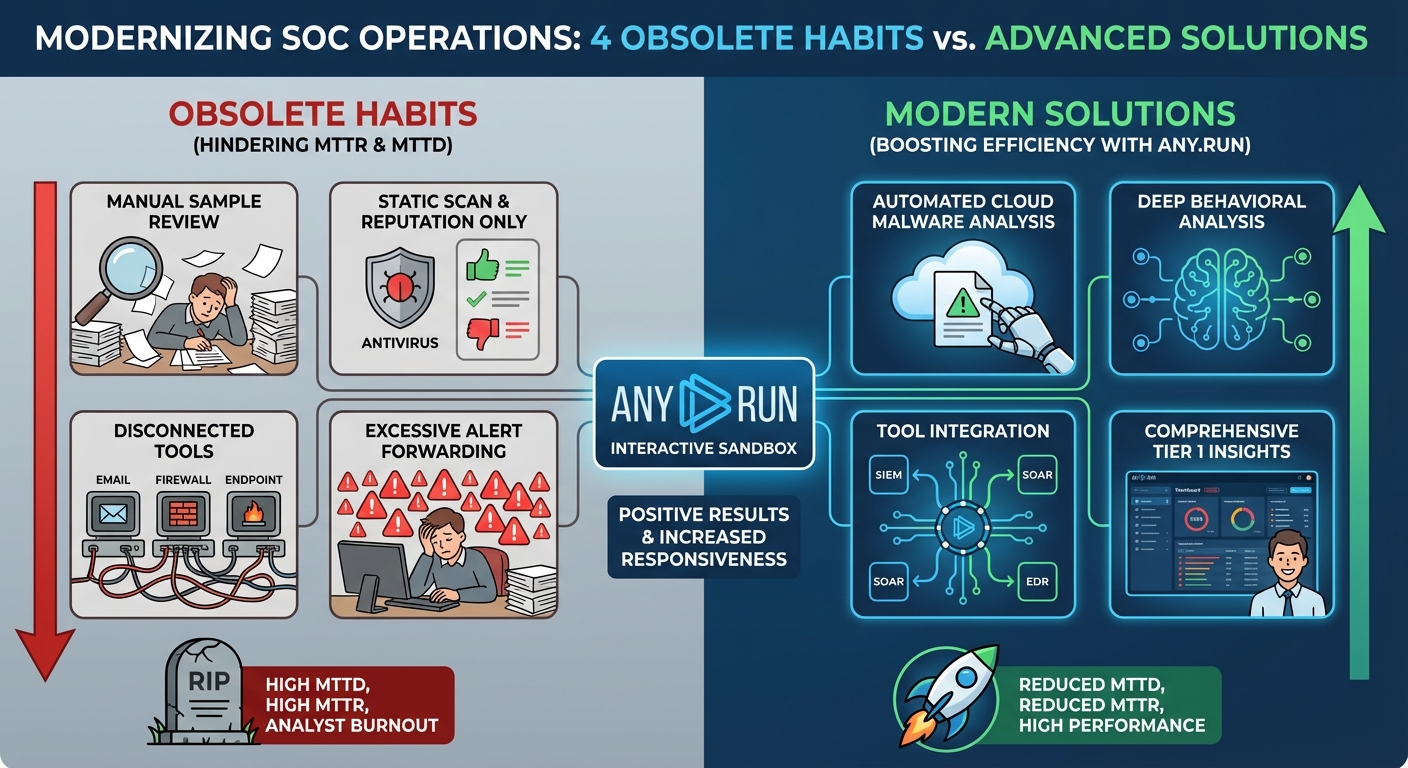 บทความนี้ระบุถึง 4 นิสัยที่ล้าสมัยในศูนย์ปฏิบัติการความปลอดภัย (SOC) ที่กำลังขัดขวางประสิทธิภาพในการตอบสนองต่อเหตุการณ์ (MTTR) และเวลาในการตรวจจับ (MTTD) ได้แก่ การตรวจสอบตัวอย่างที่น่าสงสัยด้วยตนเอง, การพึ่งพาการสแกนแบบคงที่และการตรวจสอบชื่อเสียงเพียงอย่างเดียว, การใช้เครื่องมือที่ไม่เชื่อมโยงกัน, และการส่งต่อการแจ้งเตือนที่น่าสงสัยมากเกินไป โดยนำเสนอโซลูชันที่ทันสมัย เช่น การวิเคราะห์มัลแวร์แบบอัตโนมัติบนคลาวด์ การวิเคราะห์พฤติกรรมเชิงลึก การบูรณาการเครื่องมือต่างๆ และการให้ข้อมูลเชิงลลึกที่ครอบคลุมแก่ผู้ดูแลระบบ Tier 1 เพื่อเพิ่มประสิทธิภาพและความเร็วในการตอบสนอง โดยอ้างอิงถึงผลลัพธ์เชิงบวกจากการใช้ Interactive Sandbox ของ ANY.RUN