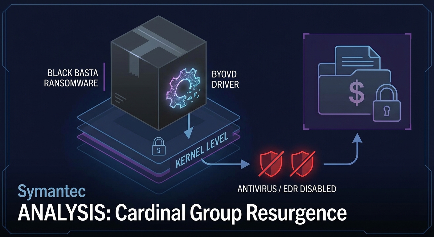 Black Basta Ransomware ได้นำกลยุทธ์ใหม่ที่ซับซ้อนยิ่งขึ้นมาใช้ โดยการฝังองค์ประกอบ “Bring Your Own Vulnerable Driver” (BYOVD) เข้าไปใน Payload ของ Ransomware โดยตรง ซึ่งช่วยให้ Ransomware สามารถปิดใช้งานซอฟต์แวร์รักษาความปลอดภัย เช่น Antivirus และเครื่องมือ EDR ในระดับ Kernel ก่อนที่จะเริ่มการเข้ารหัส ทำให้กระบวนการโจมตีรวดเร็วและมีประสิทธิภาพมากขึ้น วิธีการนี้ถูกระบุโดยนักวิเคราะห์ของ Symantec และบ่งชี้ถึงการกลับมาเคลื่อนไหวของกลุ่มอาชญากรรมไซเบอร์ Cardinal อีกครั้ง