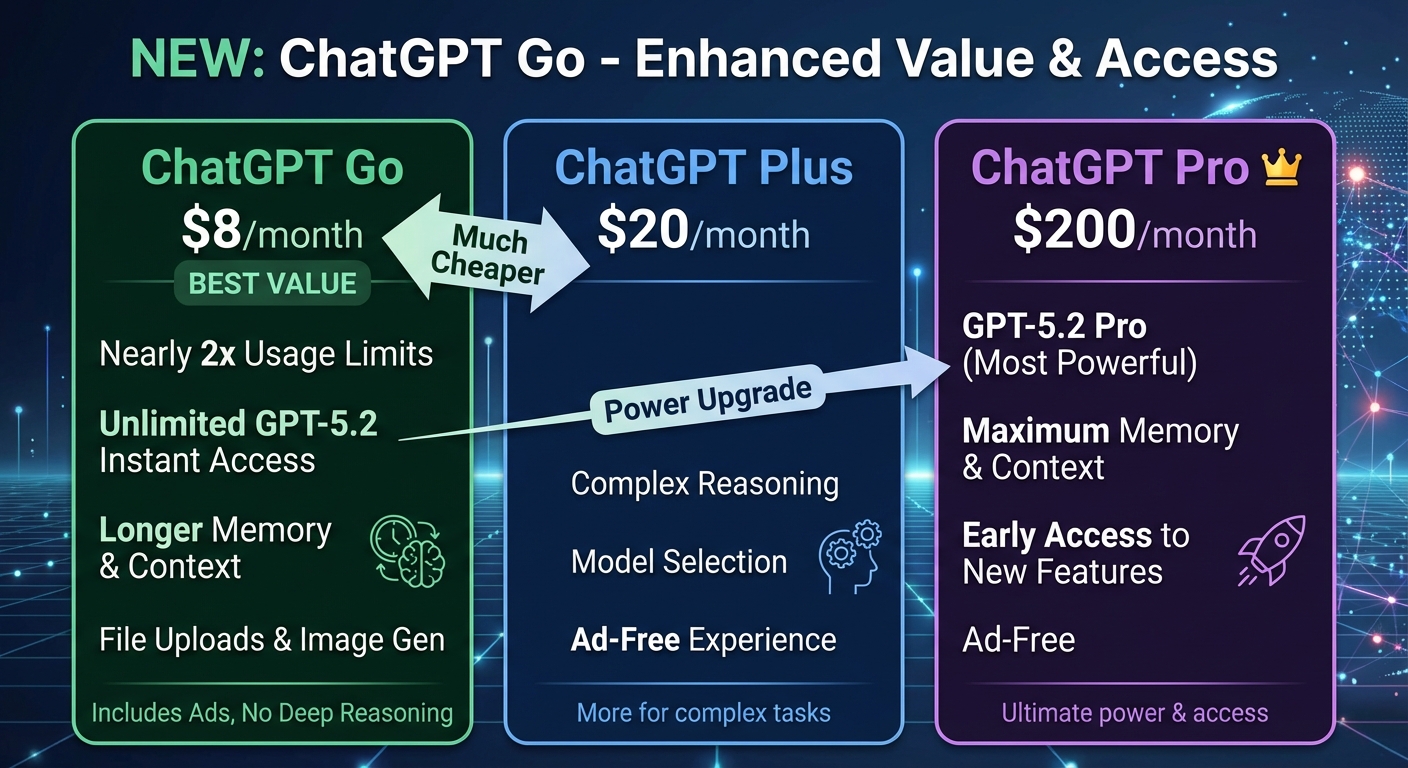 ChatGPT Go ได้รับการปรับปรุงให้คุ้มค่ายิ่งขึ้นด้วยการเพิ่มขีดจำกัดการใช้งานเกือบสองเท่าและมอบการเข้าถึง GPT 5.2 Instant แบบไม่จำกัดในราคาเพียง 8 ดอลลาร์สหรัฐฯ ต่อเดือน ซึ่งถูกกว่าแผน ChatGPT Plus ที่มีราคา 20 ดอลลาร์สหรัฐฯ มาก แผนบริการนี้มุ่งเป้าไปที่ผู้ใช้ที่ต้องการอัปโหลดไฟล์ สร้างรูปภาพ และเข้าถึงโมเดลล่าสุดในราคาที่ย่อมเยา นอกจากนี้ ChatGPT Go ยังมีหน่วยความจำและบริบทที่ยาวนานขึ้น ทำให้ AI สามารถจดจำและอ้างอิงการสนทนาในอดีตได้มากขึ้น อย่างไรก็ตาม แผน Go ไม่มีคุณสมบัติการให้เหตุผลเชิงลึกและจำกัดการใช้งานเฉพาะ GPT 5.2 Instant ในขณะที่ ChatGPT Plus ออกแบบมาสำหรับงานที่ต้องการการให้เหตุผลที่ซับซ้อนกว่าและผู้ใช้สามารถเลือกโมเดลที่ต้องการได้ นอกจากนี้ ยังมีแผน ChatGPT Pro ราคา 200 ดอลลาร์สหรัฐฯ ต่อเดือน ซึ่งให้การเข้าถึง GPT 5.2 Pro ที่ทรงพลังที่สุด พร้อมหน่วยความจำและบริบทสูงสุด รวมถึงการเข้าถึงคุณสมบัติใหม่ๆ ก่อนใคร แผน Go ยังคงมีการแสดงโฆษณา ซึ่งต่างจากแผน Plus และ Pro ที่ไม่มีโฆษณา