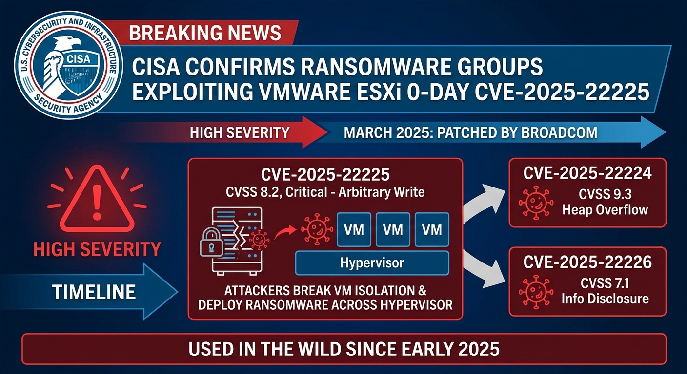 CISA (U.S. Cybersecurity and Infrastructure Security Agency) ยืนยันว่ากลุ่ม Ransomware กำลังใช้ช่องโหว่ VMware ESXi 0-day CVE-2025-22225 ซึ่งมีความรุนแรงสูง ช่องโหว่นี้ได้รับการแก้ไขโดย Broadcom ในเดือนมีนาคม 2025 ช่วยให้ผู้โจมตีสามารถหลุดพ้นจากการแยกของเครื่องเสมือน (VM isolation) และติดตั้ง Ransomware ข้าม Hypervisor ได้ ช่องโหว่ CVE-2025-22225 เป็นช่องโหว่ Arbitrary Write ใน VMware ESXi ที่มีคะแนน CVSS 8.2 (ระดับสำคัญ) ซึ่งถูกเปิดเผยพร้อมกับช่องโหว่ Zero-day อีกสองรายการ คือ CVE-2025-22224 (CVSS 9.3, Heap Overflow) และ CVE-2025-22226 (CVSS 7.1, Info Disclosure) โดยทั้งหมดถูกใช้ในการโจมตีจริงมาตั้งแต่ต้นปี 2025