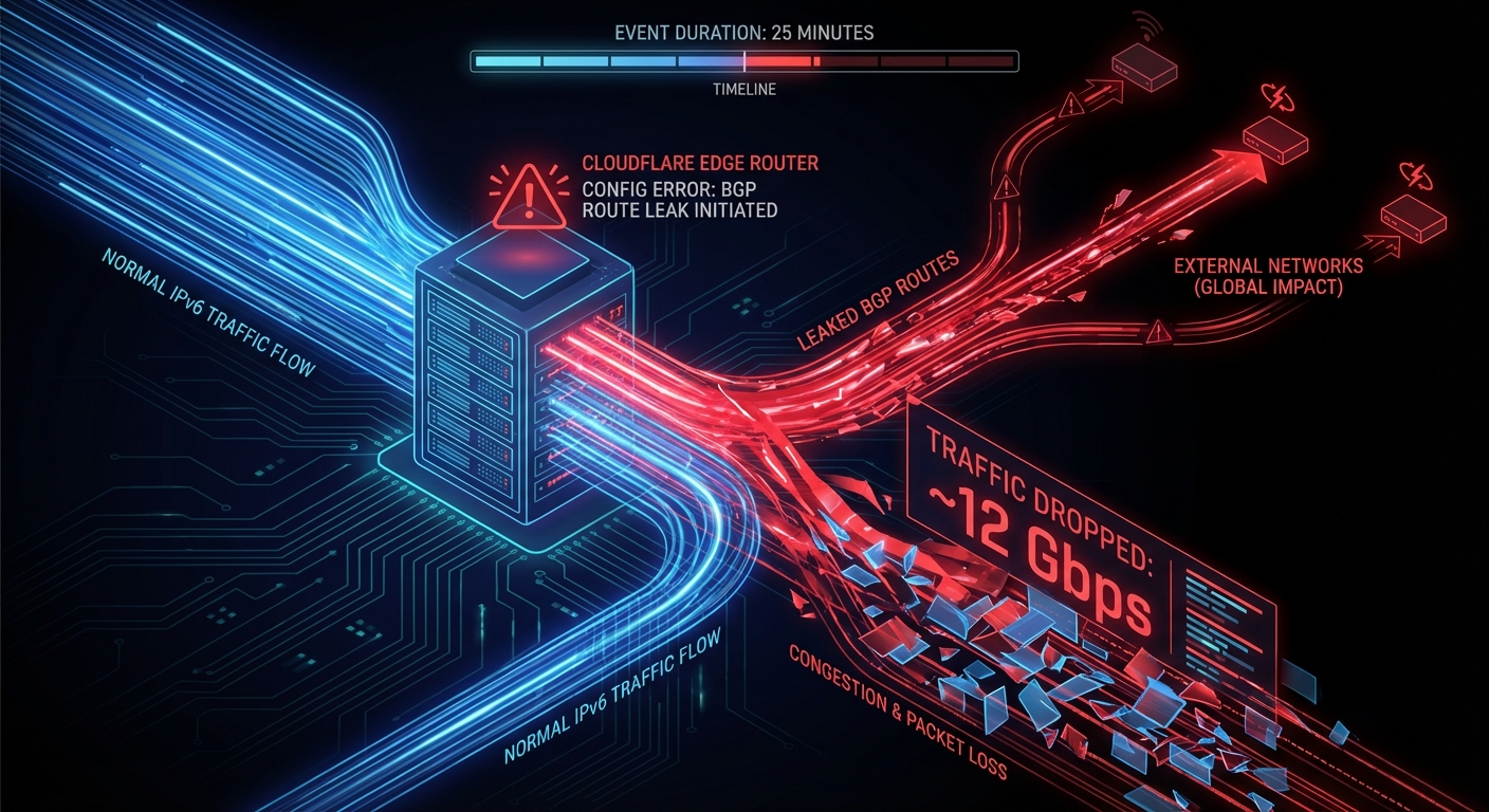 Cloudflare ได้เปิดเผยรายละเอียดเกี่ยวกับการรั่วไหลของเส้นทาง Border Gateway Protocol (BGP) ที่กินเวลานาน 25 นาที ซึ่งส่งผลกระทบต่อทราฟฟิก IPv6 ทำให้เกิดการติดขัด การสูญหายของแพ็กเก็ต และทราฟฟิกที่ถูกทิ้งไปประมาณ 12 Gbps เหตุการณ์นี้เกิดจากการตั้งค่าที่ผิดพลาดโดยไม่ได้ตั้งใจบนเราเตอร์ของ Cloudflare และส่งผลกระทบต่อเครือข่ายภายนอกนอกเหนือจากลูกค้าของ Cloudflare.