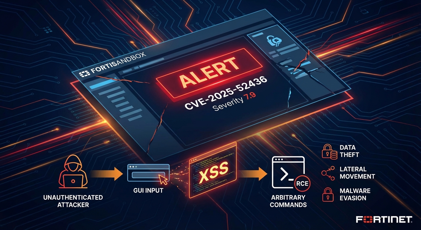 Fortinet ได้เปิดเผยช่องโหว่ Cross-Site Scripting (XSS) ระดับสูงในแพลตฟอร์ม FortiSandbox (CVE-2025-52436, FG-IR-25-093) ซึ่งอนุญาตให้ผู้โจมตีที่ไม่ผ่านการตรวจสอบสิทธิ์สามารถรันคำสั่ง arbitrary commands บนระบบที่ได้รับผลกระทบ ช่องโหว่นี้เกิดจากการจัดการอินพุตที่ไม่เหมาะสมในส่วนติดต่อผู้ใช้แบบกราฟิก (GUI) และมีคะแนนความรุนแรง 7.9 การโจมตีสามารถนำไปสู่การรันโค้ดจากระยะไกล (RCE) ซึ่งอาจส่งผลให้เกิดการขโมยข้อมูล การเคลื่อนที่ในระบบ หรือการหลีกเลี่ยงการตรวจจับมัลแวร์ในแซนด์บ็อกซ์