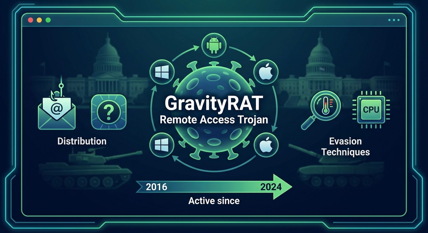 GravityRAT เป็น Remote Access Trojan (RAT) ที่กำหนดเป้าหมายหน่วยงานรัฐบาลและองค์กรทางทหารมาตั้งแต่ปี 2016 มัลแวร์นี้เริ่มต้นจากการเป็นภัยคุกคามเฉพาะ Windows แต่ได้พัฒนาเป็นเครื่องมือข้ามแพลตฟอร์มที่สามารถโจมตีระบบ Windows, Android และ macOS ได้ มัลแวร์แพร่กระจายโดยใช้แอปพลิเคชันปลอมและอีเมลหลอกลวง ทำให้ผู้ใช้ทั่วไปยากที่จะตรวจจับอันตราย GravityRAT มีเทคนิคการหลีกเลี่ยงการตรวจจับขั้นสูง เช่น การตรวจสอบอุณหภูมิ CPU เพื่อระบุสภาพแวดล้อมการทดสอบความปลอดภัย และยังคงใช้งานได้ตั้งแต่ปี 2022-2024 โดยกลุ่มแฮกเกอร์ที่มีทักษะซึ่งมีเป้าหมายและทรัพยากรที่ชัดเจน