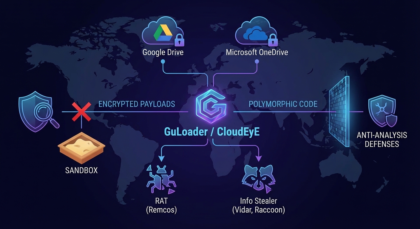 GuLoader หรือที่รู้จักในชื่อ CloudEyE เป็นดาวน์โหลดเดอร์มัลแวร์ขั้นสูงที่ยังคงเป็นภัยคุกคามต่อเนื่อง โดยถูกออกแบบมาเพื่อดาวน์โหลดและรันมัลแวร์ประเภท Remote Access Trojan (RAT) เช่น Remcos และ Info Stealers เช่น Vidar และ Raccoon Stealer. เวอร์ชันล่าสุดของ GuLoader ใช้โฮสติ้งคลาวด์ที่น่าเชื่อถืออย่าง Google Drive และ Microsoft OneDrive ในการจัดเก็บเพย์โหลดที่เข้ารหัส เพื่อหลีกเลี่ยงการตรวจจับจากระบบป้องกันที่อาศัยชื่อเสียง (reputation-based defenses) และยังใช้โค้ดแบบ Polymorphic ที่เปลี่ยนแปลงตัวเองได้ตลอดเวลาเพื่อหลบเลี่ยงการวิเคราะห์แบบ Static และการตรวจจับด้วย Signature แบบดั้งเดิม รวมถึงเทคนิคป้องกันการวิเคราะห์อื่นๆ เช่น การตรวจจับ Sandbox เพื่อขัดขวางการดีบัก.