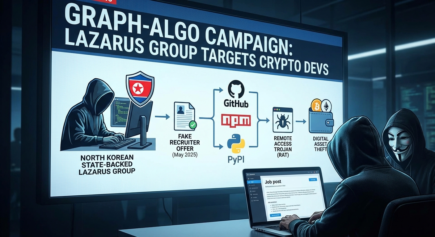 Lazarus Group ซึ่งเป็นกลุ่มแฮกเกอร์ที่ได้รับการสนับสนุนจากรัฐบาลเกาหลีเหนือ ได้เปิดฉากแคมเปญ ‘Graphalgo’ โดยปลอมตัวเป็นผู้สรรหาบุคลากรเพื่อกำหนดเป้าหมายนักพัฒนาสกุลเงินดิจิทัล แคมเปญนี้เริ่มต้นตั้งแต่เดือนพฤษภาคม 2025 โดยใช้ข้อเสนอการจ้างงานปลอมเพื่อแจกจ่าย Remote Access Trojans (RATs) ผ่านทางแพลตฟอร์มโอเพนซอร์สที่น่าเชื่อถือ เช่น GitHub, npm และ PyPI โดยมีเป้าหมายเพื่อขโมยสินทรัพย์ดิจิทัล