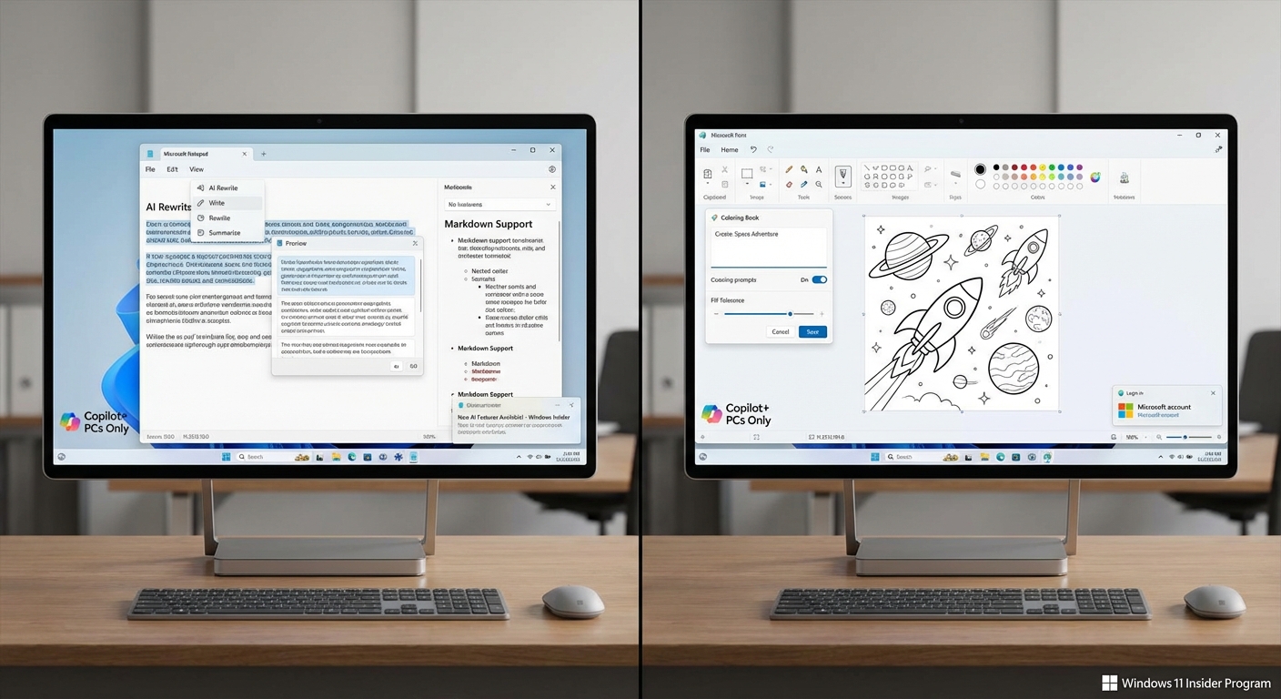 Microsoft ได้เริ่มทยอยเปิดตัวคุณสมบัติปัญญาประดิษฐ์ (AI) ใหม่ ๆ สำหรับแอปพลิเคชัน Notepad และ Paint ให้กับผู้ใช้งาน Windows 11 Insiders โดย Notepad (เวอร์ชัน 11.2512.10.0) จะได้รับความสามารถ AI ในการเขียน (Write), เขียนใหม่ (Rewrite) และสรุป (Summarize) ข้อความ ซึ่งจะแสดงผลลัพธ์พรีวิวได้รวดเร็วยิ่งขึ้น แต่ต้องเข้าสู่ระบบด้วยบัญชี Microsoft นอกจากนี้ยังเพิ่มการรองรับ Markdown เช่น รายการซ้อนกัน (nested lists) และขีดทับข้อความ (strikethrough) พร้อมหน้าจอแนะนำคุณสมบัติใหม่ สำหรับ Paint (เวอร์ชัน 11.2512.191.0) ได้เพิ่มคุณสมบัติ ‘Coloring Book’ ที่ใช้ AI สร้างหน้ากระดาษระบายสีจากข้อความสั่ง (prompts) โดยคุณสมบัตินี้จะใช้งานได้เฉพาะบน Copilot+ PCs และต้องใช้บัญชี Microsoft ในการเข้าถึง รวมถึงเพิ่มแถบเลื่อนปรับความทนทานในการเติมสี (fill tolerance slider) ด้วย หากผู้ใช้ไม่ต้องการคุณสมบัติ AI เหล่านี้ สามารถปิดการใช้งานหรือถอนการติดตั้งแอปได้