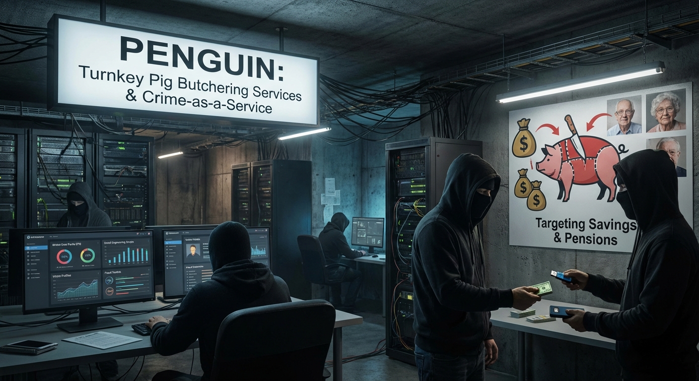 โลกของอาชญากรรมไซเบอร์ได้ก้าวไปอีกขั้น เมื่อการหลอกลวงแบบ Pig Butchering ได้พัฒนาเป็นบริการแบบเบ็ดเสร็จ (turnkey services) ซึ่งช่วยลดอุปสรรคในการเข้าถึงสำหรับผู้ไม่ประสงค์ดีทั่วโลก ‘Penguin’ เป็นปฏิบัติการที่เป็นตลาดซื้อขายที่เติบโตขึ้น โดยให้บริการทุกอย่างที่นักต้มตุ๋นต้องการเพื่อดำเนินการฉ้อโกงขนาดใหญ่ ตั้งแต่ข้อมูลส่วนบุคคลที่ถูกขโมยไปจนถึงชุดเครื่องมือและเทมเพลตการฉ้อโกงสำเร็จรูป รูปแบบบริการนี้สะท้อนแพลตฟอร์ม Crime-as-a-Service อื่นๆ แต่พุ่งเป้าไปที่เหยื่อผ่านกลโกงทางวิศวกรรมสังคมเพื่อดูดเงินเก็บและเงินบำนาญ