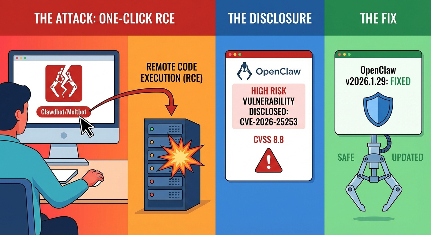 ช่องโหว่ความปลอดภัยระดับสูงใน OpenClaw (หรือที่รู้จักในชื่อ Clawdbot และ Moltbot) ได้ถูกเปิดเผย ซึ่งอนุญาตให้สามารถรันโค้ดจากระยะไกล (RCE) ได้ในคลิกเดียวผ่านการใช้ลิงก์ที่เป็นอันตราย ช่องโหว่นี้คือ CVE-2026-25253 (CVSS 8.8) ซึ่งได้รับการแก้ไขแล้วในเวอร์ชัน 2026.1.29.