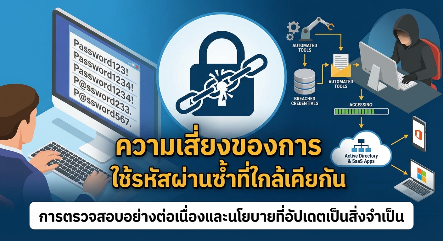 บทความนี้เน้นย้ำถึงความเสี่ยงที่มักถูกมองข้ามในการรักษาความปลอดภัยทางไซเบอร์ นั่นคือ ‘การนำรหัสผ่านที่ใกล้เคียงกันกลับมาใช้ซ้ำ’ (near-identical password reuse) แม้จะมีนโยบายรหัสผ่านที่เข้มงวด แต่ผู้ใช้มักจะปรับเปลี่ยนรหัสผ่านเดิมเพียงเล็กน้อยและคาดเดาได้ เพื่อให้ผ่านเกณฑ์การตรวจสอบแต่ยังคงจำง่าย ผู้โจมตีใช้ประโยชน์จากรูปแบบที่คาดเดาได้เหล่านี้ด้วยเครื่องมืออัตโนมัติและข้อมูลรับรองที่ถูกละเมิดในอดีต ทำให้สามารถหลีกเลี่ยงนโยบายรหัสผ่านแบบดั้งเดิมและเข้าถึงระบบองค์กรได้ในวงกว้าง ความเสี่ยงนี้ส่งผลกระทบต่อความปลอดภัยขององค์กรในหลายแพลตฟอร์ม รวมถึงระบบ Active Directory, แอปพลิเคชัน SaaS และอุปกรณ์ส่วนตัวที่เชื่อมต่อกับข้อมูลองค์กร การแก้ปัญหาต้องอาศัยการตรวจสอบอย่างต่อเนื่อง การวิเคราะห์ความคล้ายคลึงของรหัสผ่าน และการอัปเดตนโยบายเพื่อบล็อกรหัสผ่านที่คล้ายกันตั้งแต่เริ่มต้น