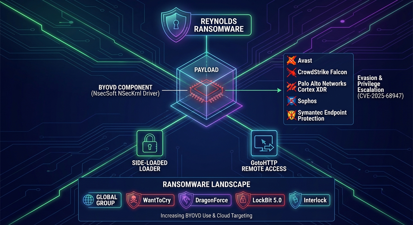 นักวิจัยด้านความปลอดภัยทางไซเบอร์ได้เปิดเผยรายละเอียดเกี่ยวกับ ransomware ตระกูลใหม่ที่ชื่อ ‘Reynolds’ ซึ่งมาพร้อมกับคอมโพเนนต์ Bring Your Own Vulnerable Driver (BYOVD) ที่ฝังอยู่ภายในตัว payload ของ ransomware เอง โดยมีวัตถุประสงค์เพื่อหลบเลี่ยงการป้องกัน การโจมตีนี้ใช้ประโยชน์จากไดรเวอร์ NsecSoft NSecKrnl ที่มีช่องโหว่ (CVE-2025-68947) เพื่อยกระดับสิทธิ์และปิดการทำงานของโซลูชัน Endpoint Detection and Response (EDR) จากผู้ให้บริการหลายราย รวมถึง Avast, CrowdStrike Falcon, Palo Alto Networks Cortex XDR, Sophos และ Symantec Endpoint Protection การฝังคอมโพเนนต์การหลบเลี่ยงการป้องกันไว้ใน payload โดยตรงนี้เป็นเทคนิคที่ทำให้การตรวจจับและการตอบสนองต่อการโจมตีซับซ้อนยิ่งขึ้น นอกจากนี้ ยังมีการตรวจพบ loader แบบ side-loaded และโปรแกรมเข้าถึงระยะไกล GotoHTTP ที่ถูกใช้เพื่อรักษาการเข้าถึงระบบที่ถูกบุกรุก ข่าวนี้ยังเน้นย้ำถึงแนวโน้มที่เพิ่มขึ้นของการใช้ BYOVD และการพัฒนาของกลุ่ม ransomware ต่างๆ เช่น GLOBAL GROUP, WantToCry, DragonForce, LockBit 5.0 และ Interlock ซึ่งมีการใช้เทคนิคการโจมตีที่หลากหลายและการขยายเป้าหมายไปยังบริการคลาวด์