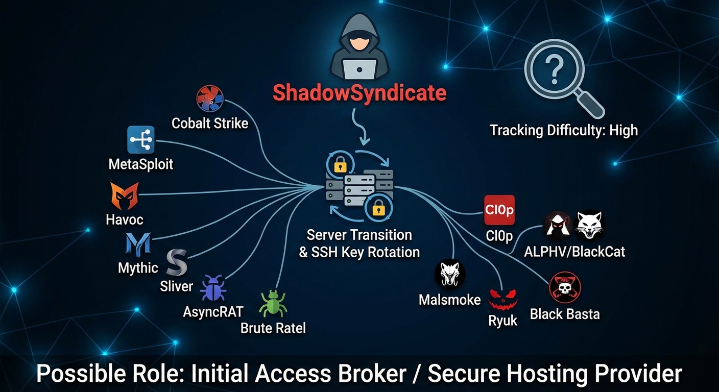 ShadowSyndicate กลุ่มกิจกรรมมุ่งร้ายที่ถูกระบุครั้งแรกในปี 2022 ได้พัฒนาเทคนิคการจัดการโครงสร้างพื้นฐานโดยใช้การเปลี่ยนเซิร์ฟเวอร์ (server transition) ซึ่งช่วยให้ผู้คุกคามสามารถหมุนเวียน SSH keys ในหลายเซิร์ฟเวอร์ได้ วิธีการใหม่นี้ทำให้ทีมรักษาความปลอดภัยติดตามการปฏิบัติงานของกลุ่มได้ยากขึ้น ซึ่งแตกต่างจากวิธีการเดิมที่ใช้ SSH fingerprint เดียว นอกจากนี้ โครงสร้างพื้นฐานที่ถูกค้นพบใหม่ยังเชื่อมโยงกับการใช้งานเฟรมเวิร์กการโจมตีหลายอย่าง เช่น Cobalt Strike, MetaSploit, Havoc, Mythic, Sliver, AsyncRAT, MeshAgent และ Brute Ratel และมีความเชื่อมโยงกับกลุ่มแรนซัมแวร์อื่น ๆ เช่น Cl0p, ALPHV/BlackCat, Black Basta, Ryuk และ Malsmoke ซึ่งบ่งชี้ว่า ShadowSyndicate อาจทำหน้าที่เป็นผู้จัดหาช่องทางเข้าถึงเบื้องต้น (Initial Access Broker) หรือให้บริการโฮสติ้งที่ปลอดภัยแก่กลุ่มอาชญากรไซเบอร์