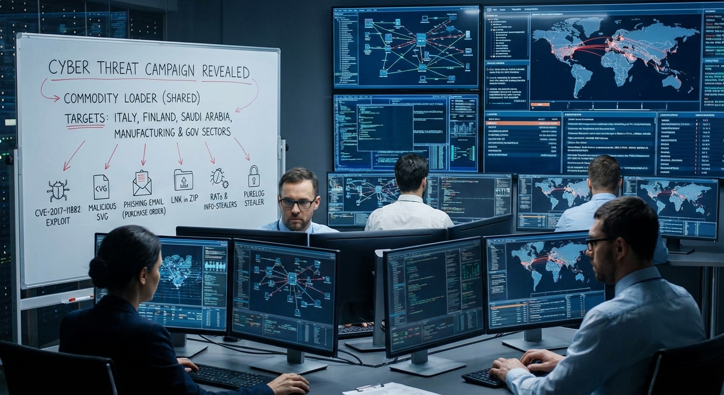 นักวิจัยด้านภัยคุกคามไซเบอร์ได้เปิดเผยถึงแคมเปญมัลแวร์ที่ซับซ้อน โดยใช้โหลดเดอร์เชิงพาณิชย์ (commodity loader) ที่มีการใช้งานร่วมกันในกลุ่มผู้ก่อภัยคุกคามหลายกลุ่ม การโจมตีนี้พุ่งเป้าไปที่องค์กรภาคการผลิตและภาครัฐในอิตาลี ฟินแลนด์ และซาอุดีอาระเบีย มีเป้าหมายเพื่อดึงข้อมูลอุตสาหกรรมและขโมยข้อมูลประจำตัวผู้ดูแลระบบที่ละเอียดอ่อน แคมเปญนี้ใช้กลยุทธ์การหลบเลี่ยงการตรวจจับหลายชั้น รวมถึงการใช้เอกสาร Office ที่มีช่องโหว่ CVE-2017-11882, ไฟล์ SVG ที่เป็นอันตราย และไฟล์ ZIP ที่มีทางลัด LNK ในอีเมลฟิชชิ่งที่ปลอมเป็นใบสั่งซื้อ โหลดเดอร์ดังกล่าวทำหน้าที่กระจาย Remote Access Trojans (RATs) และมัลแวร์ขโมยข้อมูล (information-stealing malware) โดยมัลแวร์สุดท้ายที่ถูกส่งคือ PureLog Stealer.