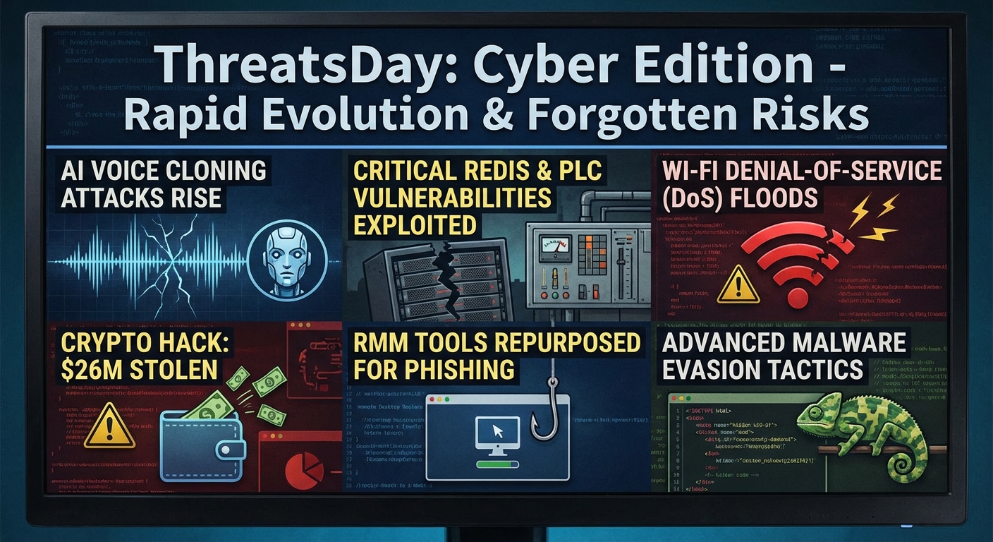 ข่าว ThreatsDay ฉบับนี้รวบรวมเหตุการณ์ด้านความปลอดภัยทางไซเบอร์ที่สำคัญประจำสัปดาห์ โดยเน้นย้ำถึงวิวัฒนาการอย่างรวดเร็วของวิธีการโจมตี ช่องโหว่ที่ถูกมองข้ามซึ่งนำไปสู่ความเสี่ยงใหญ่หลวง และการนำเครื่องมือเก่ามาใช้ในรูปแบบใหม่เพื่อการบุกรุก ข่าวเด่นได้แก่ การโจมตีด้วยการโคลนเสียง AI, ช่องโหว่ร้ายแรงใน Redis และ PLC, การโจมตีแบบปฏิเสธการให้บริการ (DoS) ใน Wi-Fi, การแฮกเงินคริปโต 26 ล้านดอลลาร์ และการใช้เครื่องมือ RMM ในการฟิชชิ่ง รวมถึงกลยุทธ์การหลบเลี่ยงการตรวจจับของมัลแวร์ที่ซับซ้อน.