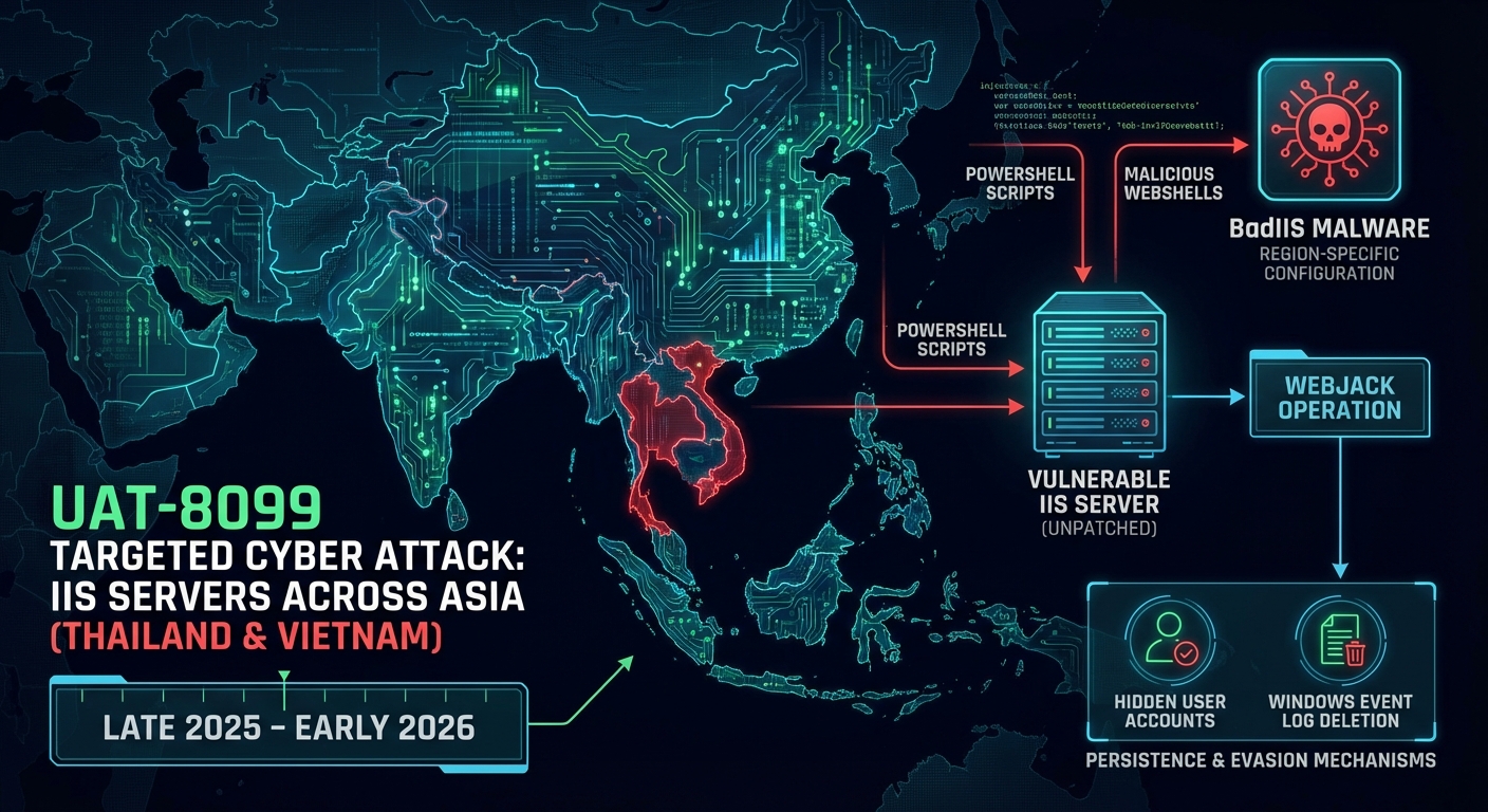 กลุ่ม UAT-8099 ได้เปิดฉากการโจมตีแบบพุ่งเป้าครั้งใหม่ต่อเซิร์ฟเวอร์ Internet Information Services (IIS) ทั่วเอเชีย โดยเฉพาะในประเทศไทยและเวียดนาม การโจมตีซึ่งเริ่มตั้งแต่ปลายปี 2025 ถึงต้นปี 2026 นี้ มีการใช้มัลแวร์ที่ซับซ้อนเพื่อเจาะระบบที่อ่อนแอ อาศัยช่องโหว่ของเซิร์ฟเวอร์ IIS ที่ไม่ได้แพตช์ เพื่อฝังเว็บเชลล์ที่เป็นอันตราย, รันสคริปต์ PowerShell และติดตั้งมัลแวร์ BadIIS ซึ่งถูกปรับแต่งให้มีคอนฟิกูเรชันเฉพาะภูมิภาค การโจมตีนี้ยังพบความเชื่อมโยงกับการปฏิบัติการ WEBJACK ก่อนหน้านี้ และใช้กลไกในการคงอยู่และหลบเลี่ยงการตรวจจับที่หลากหลาย รวมถึงการสร้างบัญชีผู้ใช้ที่ซ่อนอยู่และการลบหลักฐานในบันทึกเหตุการณ์ของ Windows