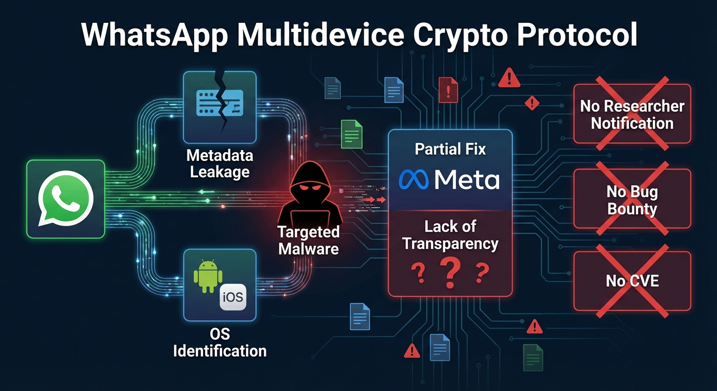 โปรโตคอลการเข้ารหัสแบบหลายอุปกรณ์ของ WhatsApp มีช่องโหว่ในการรั่วไหลของข้อมูลเมตามานาน ทำให้ผู้โจมตีสามารถระบุระบบปฏิบัติการของอุปกรณ์ผู้ใช้งานได้ ซึ่งเป็นประโยชน์ในการส่งมัลแวร์แบบกำหนดเป้าหมาย งานวิจัยล่าสุดเผยว่า Meta ได้ทำการแก้ไขบางส่วนแล้ว แต่ปัญหาสภาวะการขาดความโปร่งใสยังคงอยู่ โดยเฉพาะอย่างยิ่งการขาดการแจ้งเตือนนักวิจัย, การให้รางวัล Bug Bounty, หรือการจัดสรร CVE.